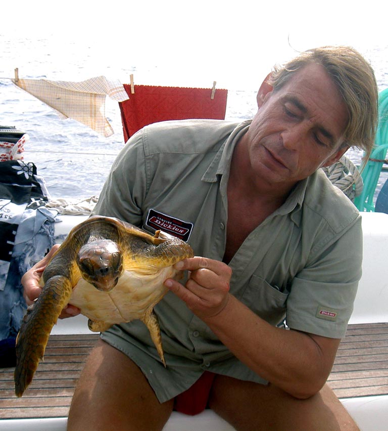 eine Meeresschildkröte, die völlig gefesselt in dem Abfall trieb. Sie lebte noch.