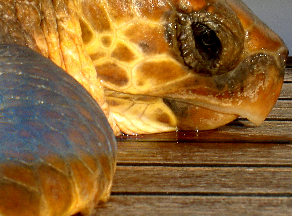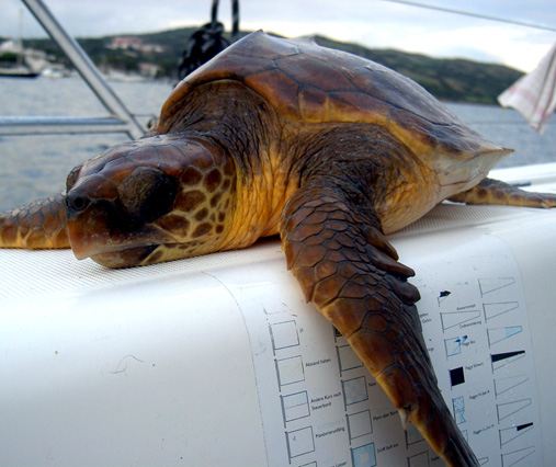 Eulalia ist eine Karettschildkröte (Caretta caretta) und gehört zu den stark